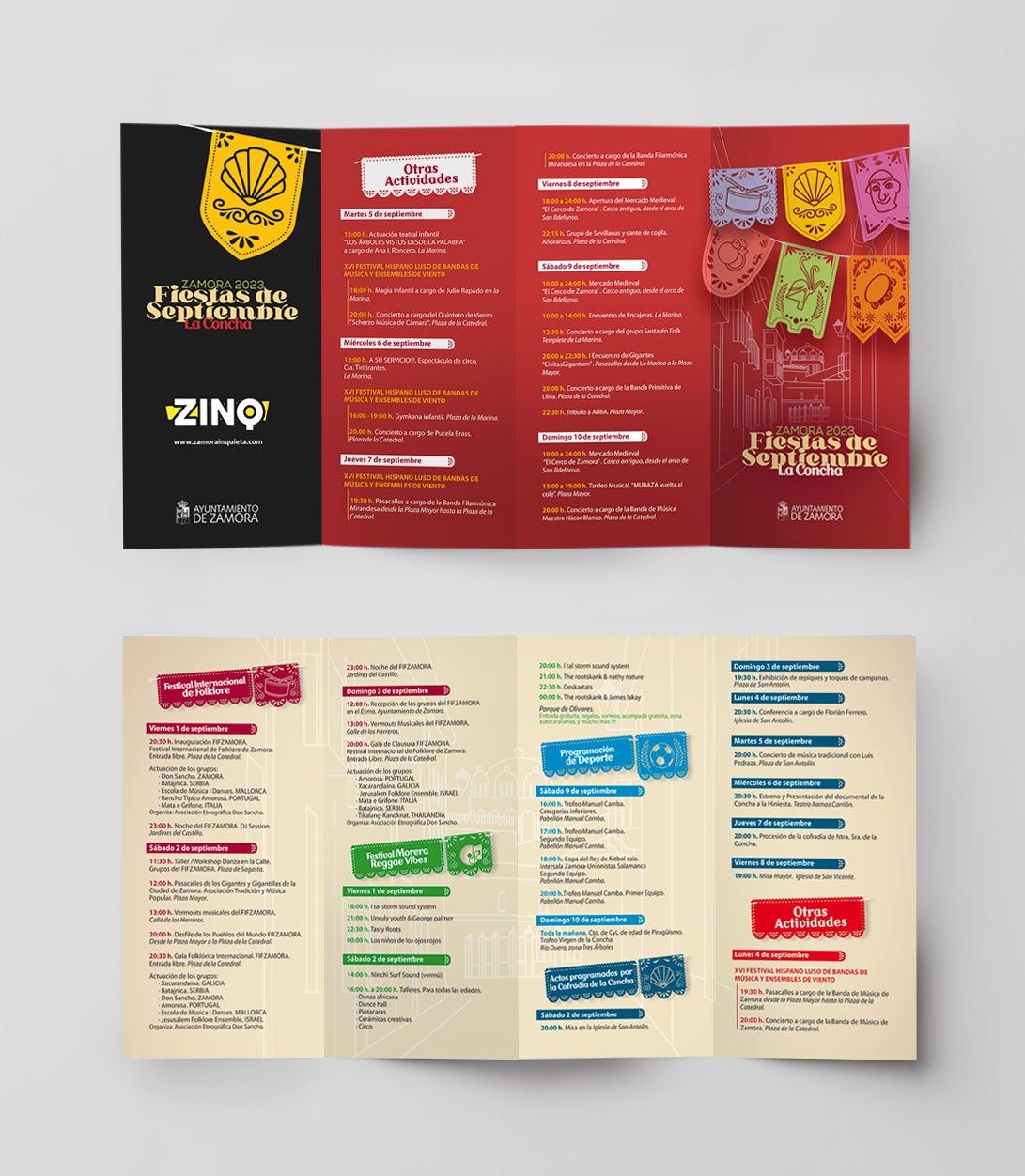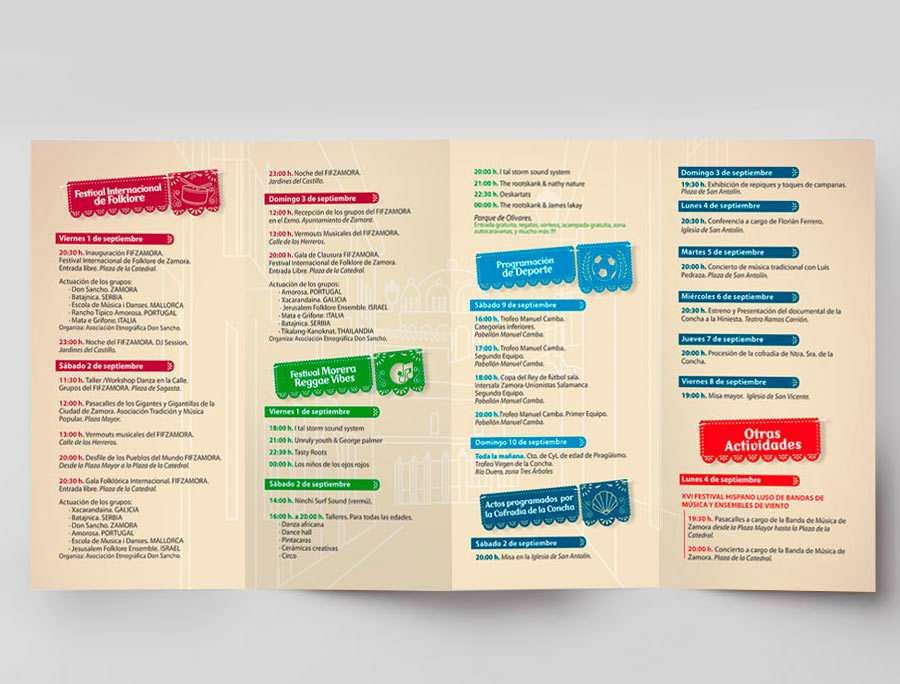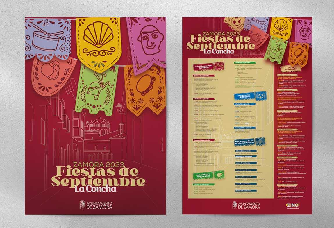 Proyecto de diseño gráfico para las fiestas patronales de septiembre en Zamora. El trabajo incluyó la creación del cartel principal, el folleto informativo y los mupis urbanos, con una propuesta visual que combina tradición local y un enfoque contemporáneo. Colores vivos, tipografía clara y una identidad coherente para comunicar el evento en distintos soportes.